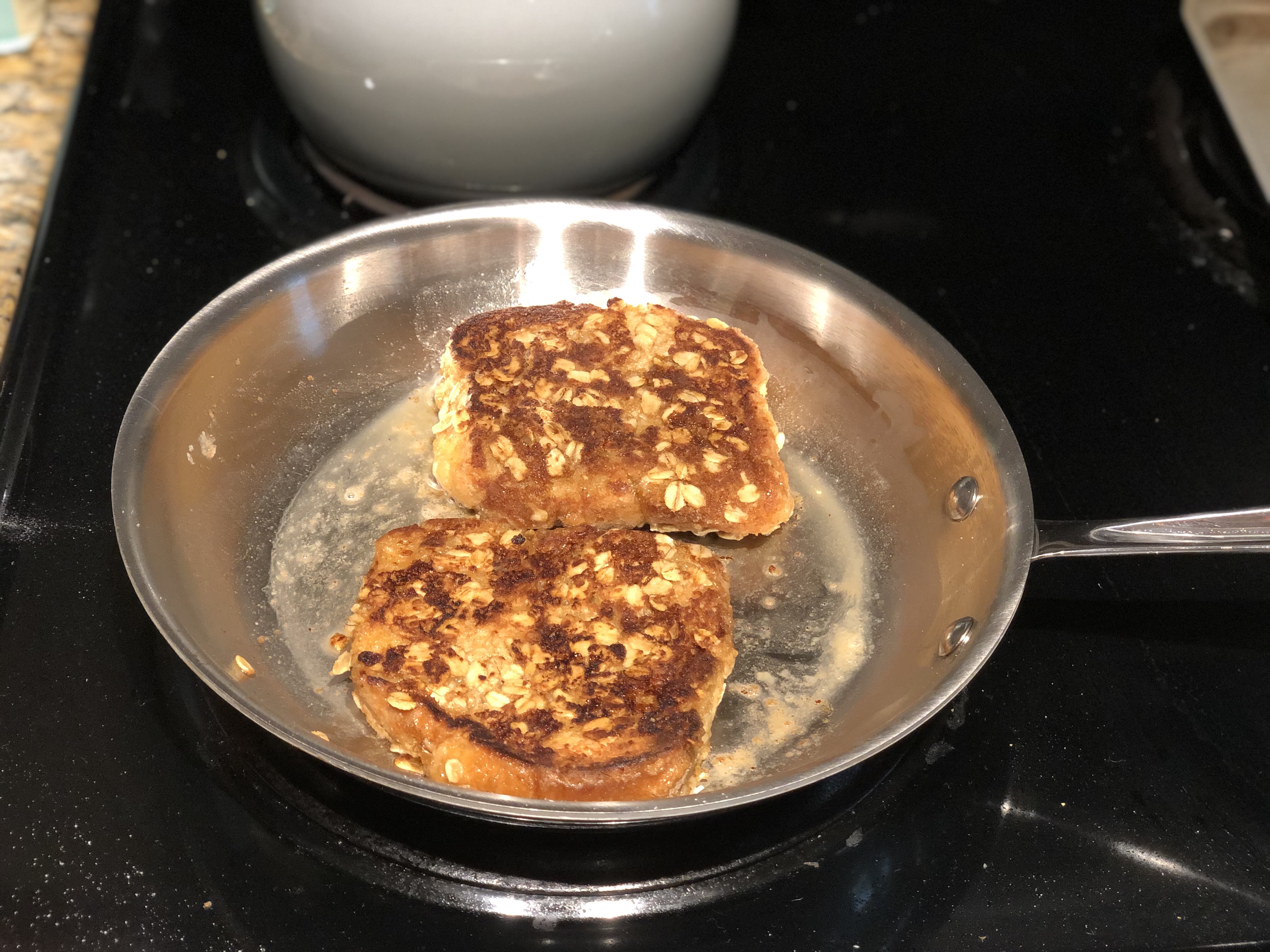 - Place 2 slices into your buttered pan at a time and cook 4-5 minutes per side. Check before flipping, you want each side to be a perfect golden brown!